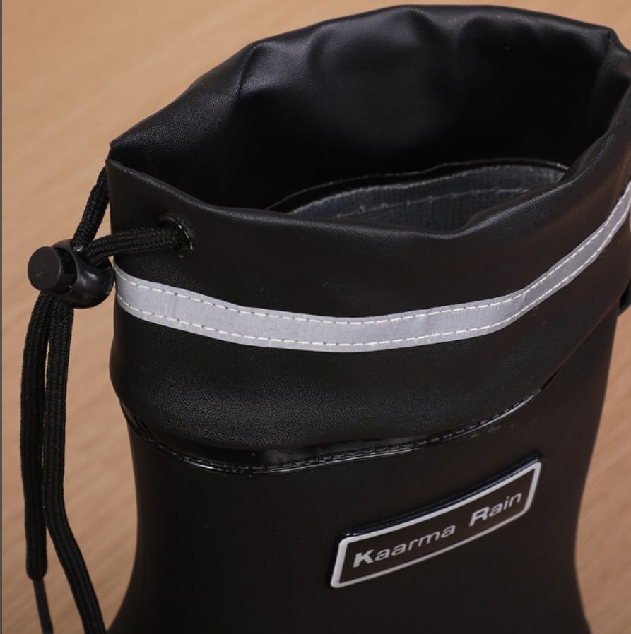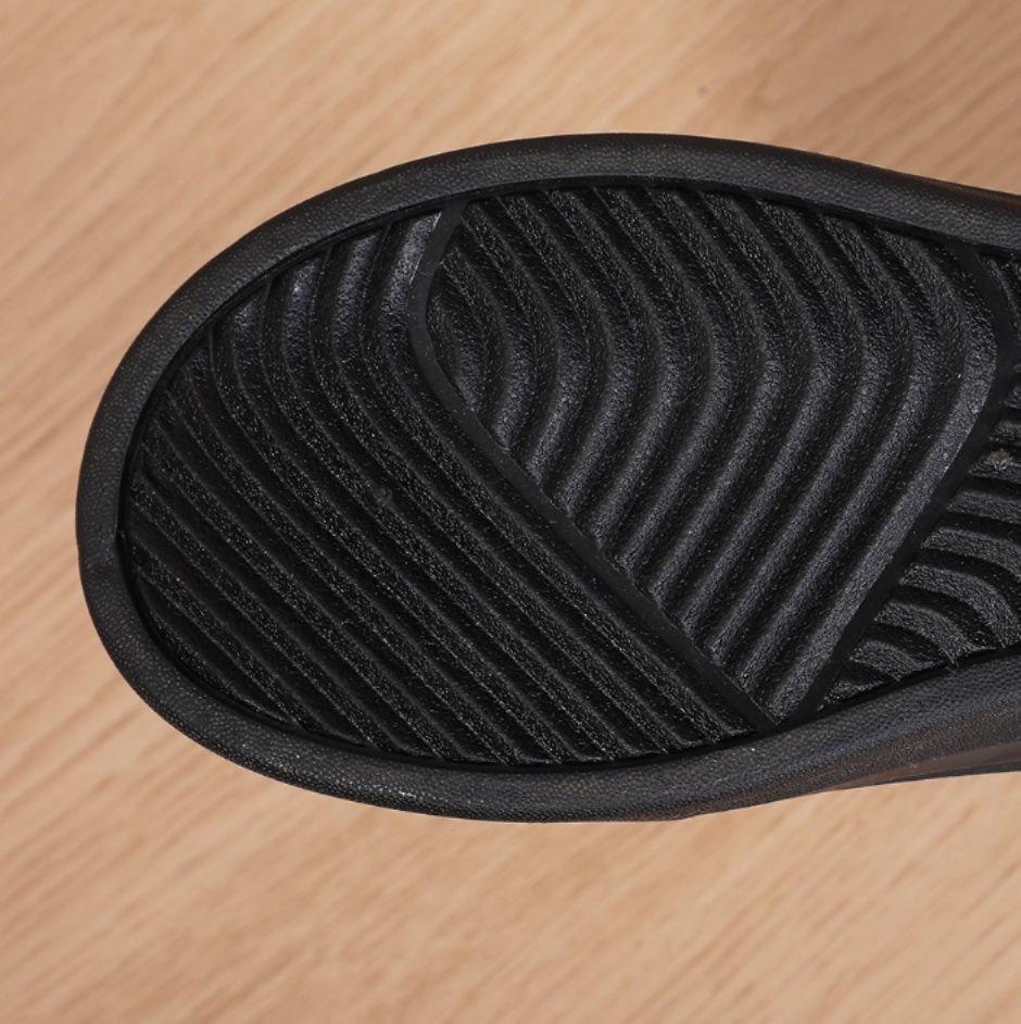 高位置の履き口設計により水の侵入をしっかり防ぎ、靴底には滑りにくい溝加工が施されています。
